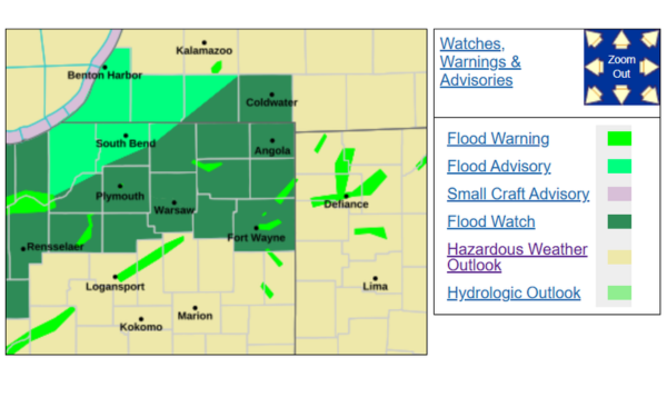 WARSAW — Recent heavy rains, combined with a 100 percent chance of precipitation Saturday across northern Indiana, have led to a flood watch until 5 p.m. for Kosciusko County.