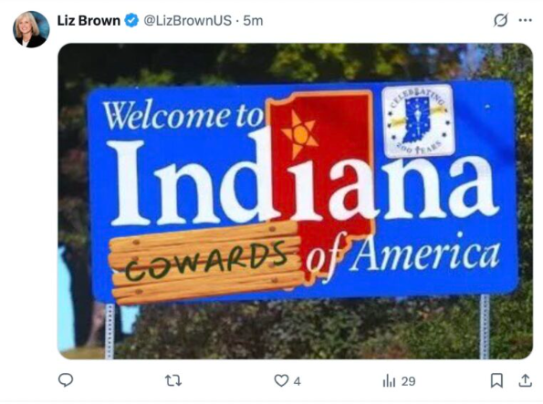 State Sen. Liz Brown, R-Fort Wayne, was also one of the loudest supporters of redistricting and she took to social media to call Indiana a state of “cowards.”